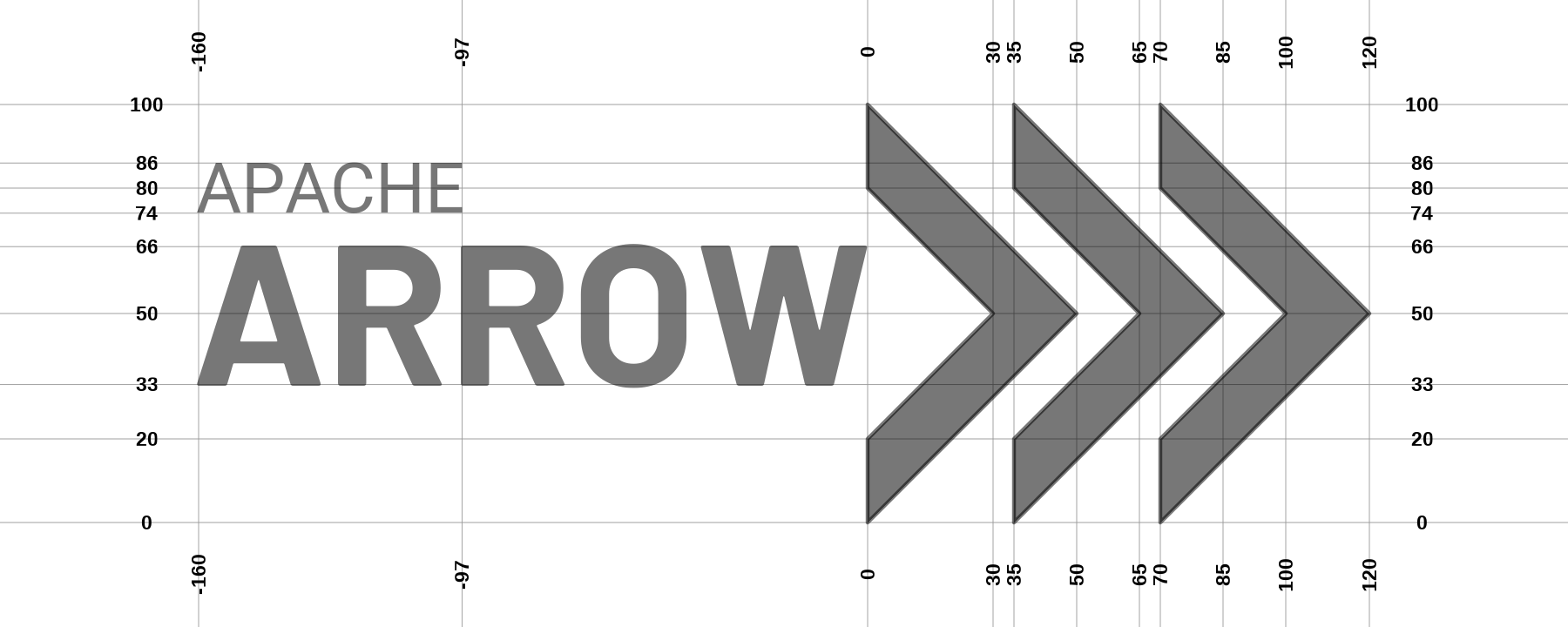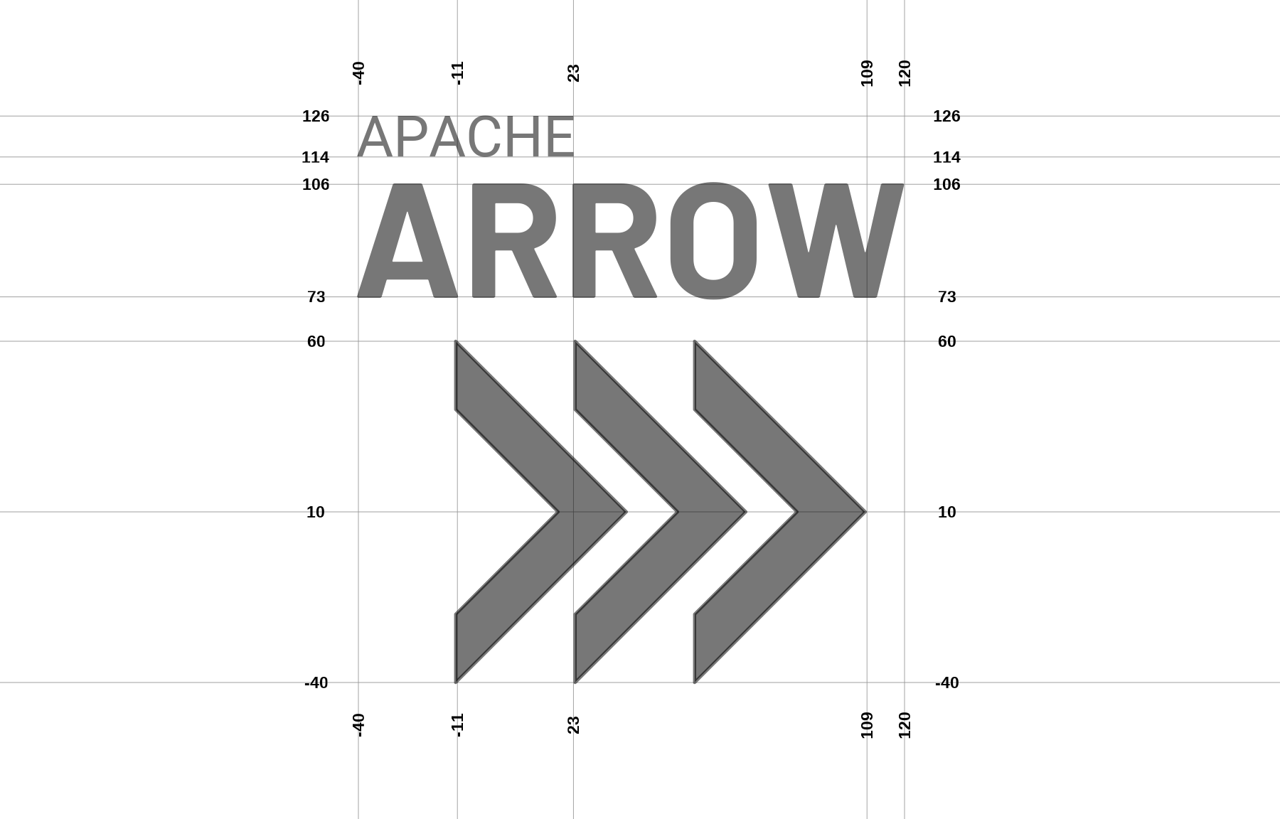 The annotated image below shows the precise spacing used in the horizontal version of the Apache Arrow logo as well as the design of the Triple Chevron. Each chevron has width exactly half its height, and forms a 90-degree angle at the tip. The thickness (both vertically and horizontally) of the chevron is 20% of its height. The spacing between adjacent chevrons is 15% of the height (i.e., if height = 100, width = 50, and spacing = 15).